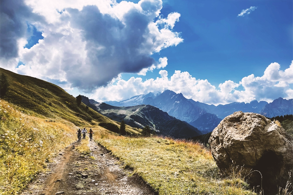 Si parte con le nostre ebike da Canazei e con alcune interessanti salite si raggiunge la quota di 2485 fino allo scollinamento del rifugio Valentini sul Passo Sella. Dal vicino rifugio Passo Sella la salita riprende nel paesaggio lunare della Città dei Sassi, accompagnata dai superbi panorami su Val Gardena, Pordoi e sul massiccio delle Odle.