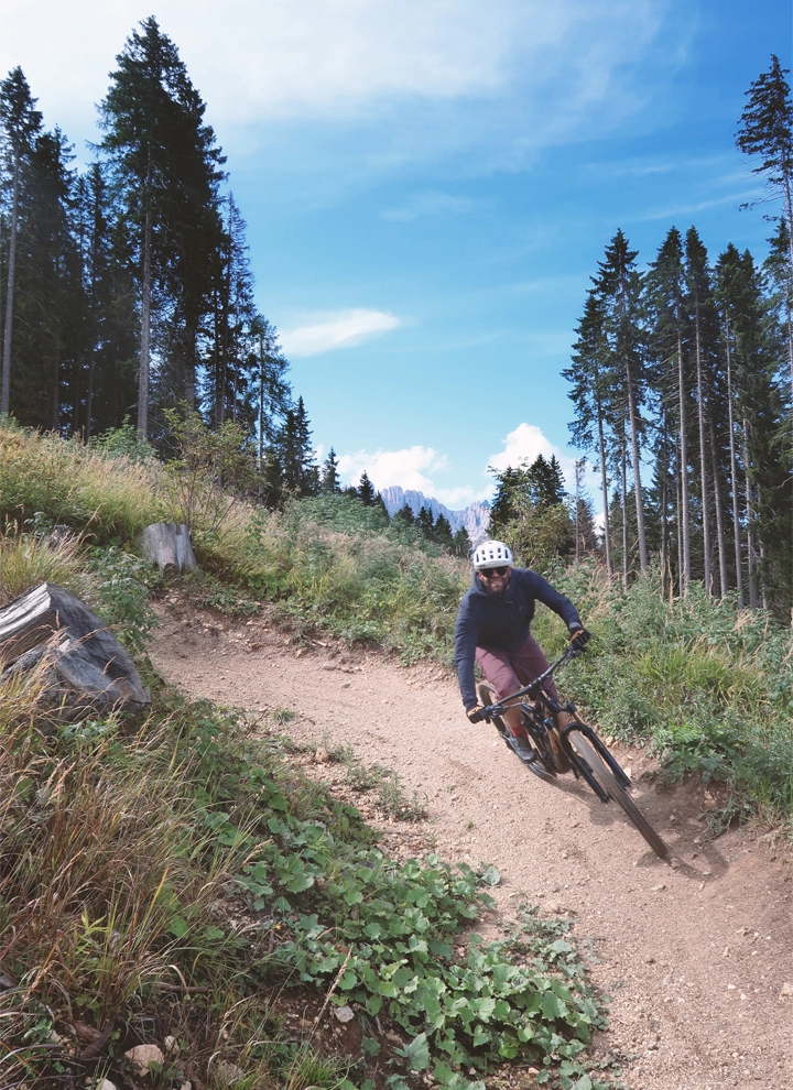 Si comincia con l’entusiasmante discesa in sella alle nostre emtb lungo il Carezza Trail, un lungo single track che, con dossi e paraboliche, passerelle e passaggi divertenti mai eccessivamente tecnici, scende a Nova Levante.
